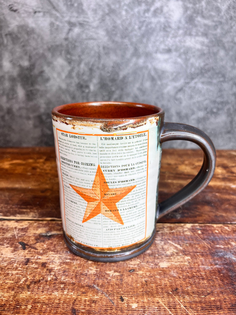 Wheel thrown and glazed porcelain pottery mug. Designed with vintage Portland Packing Maine lobster can label. Microwave and dishwasher safe.