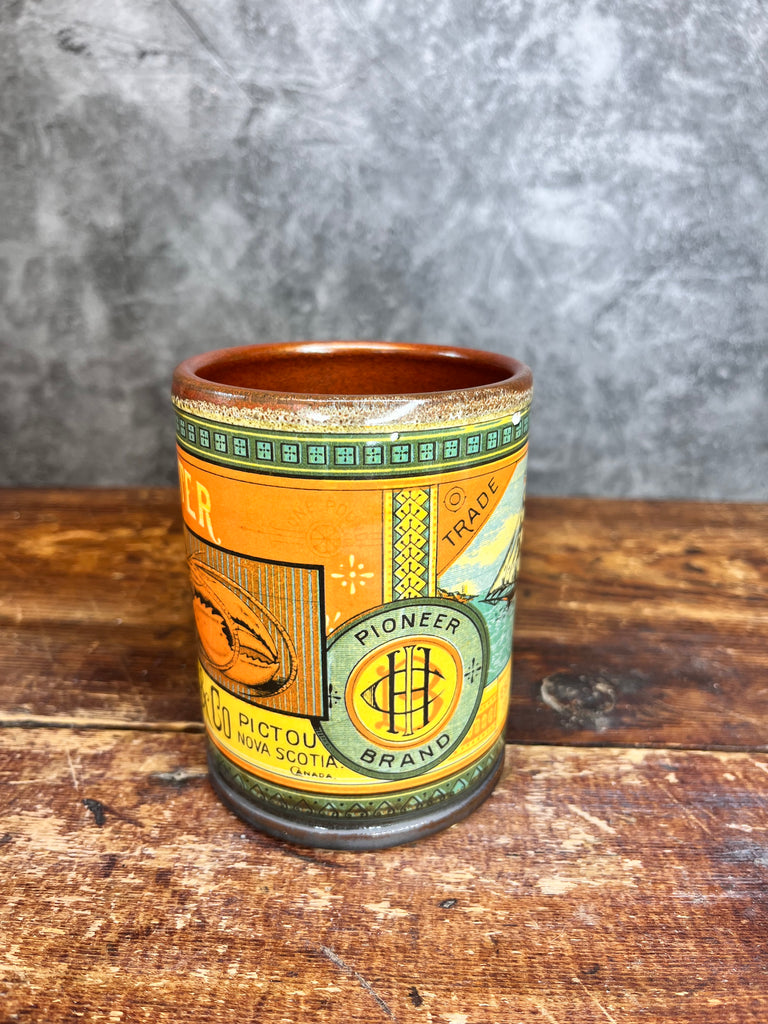 Wheel thrown and glazed porcelain pottery mug. Designed with vintage Hamblen Pictou NS Lobster can label. Microwave and dishwasher safe.