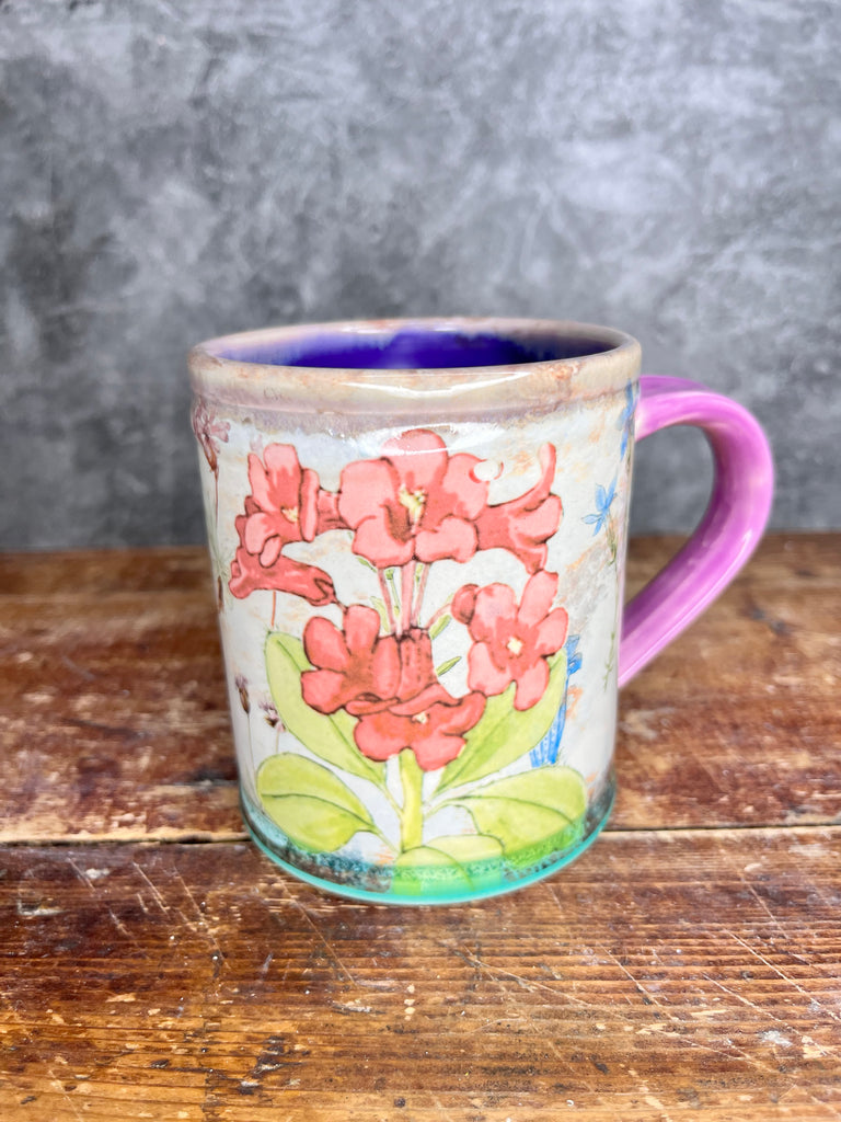 Wheel thrown and glazed porcelain pottery decorated with vintage flower illustrations . Microwave and dishwasher safe.